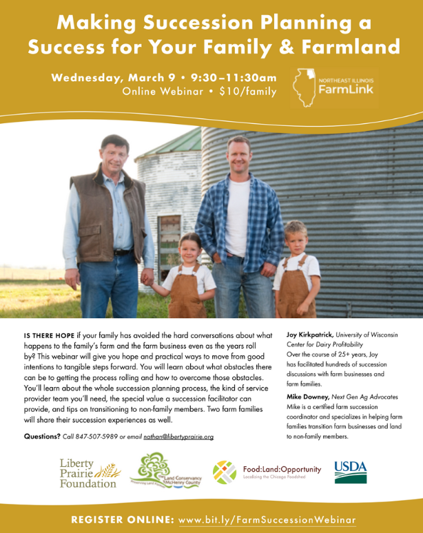 More information and registration here: https://libertyprairiefoundation.salsalabs.org/MakingSuccessionPlanningaSuccessforYourFamilyFarmland/index.html